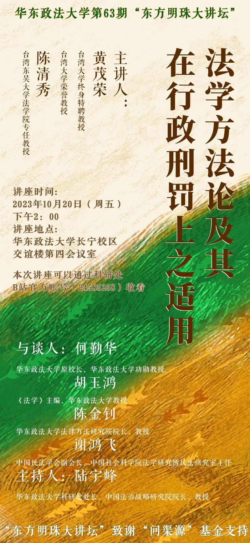 有鑒于此,華東政法大學第63期“東方明珠大講壇”有幸邀請到臺灣大學終身特聘教授黃茂榮教授、臺灣東吳大學法學院陳清秀教授主講“法學方法論及其在行政刑罰上之適用”