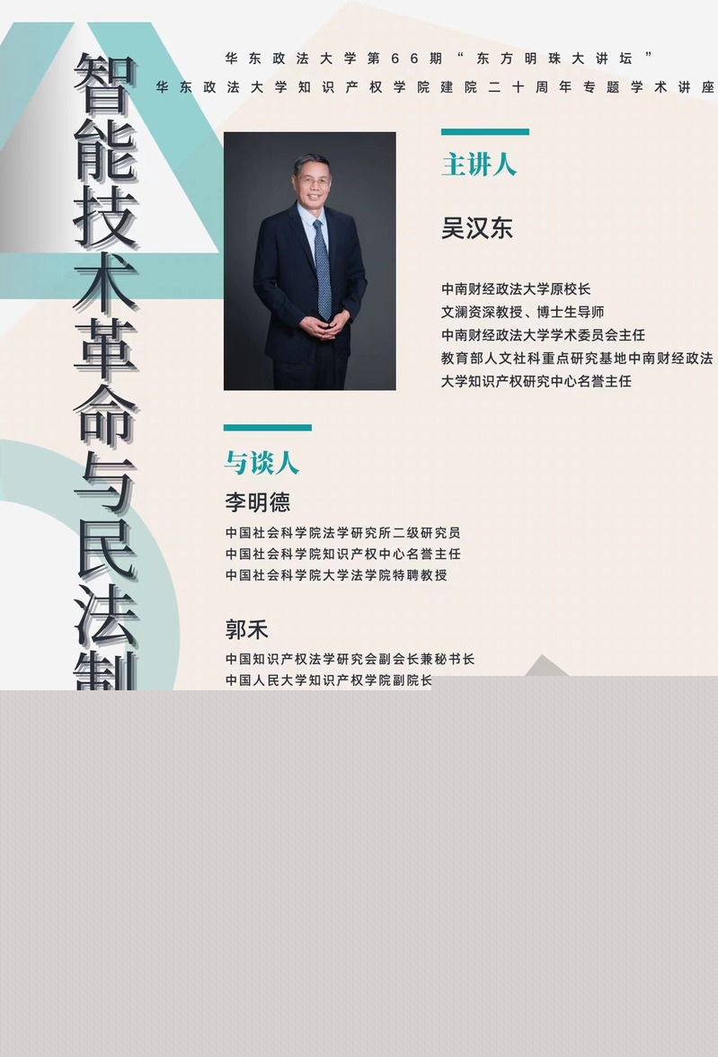 有鑒于此,華東政法大學第66期“東方明珠大講壇”有幸邀請到中南財經政法大學原校長、文瀾資深教授、博士生導師、中南財經政法大學學術委員會主任、教育部人文社科重點研究基地中南財經政法大學知識產權研究中心名譽主任吳漢東教授主講“智能技術革命與民法制度創新”。