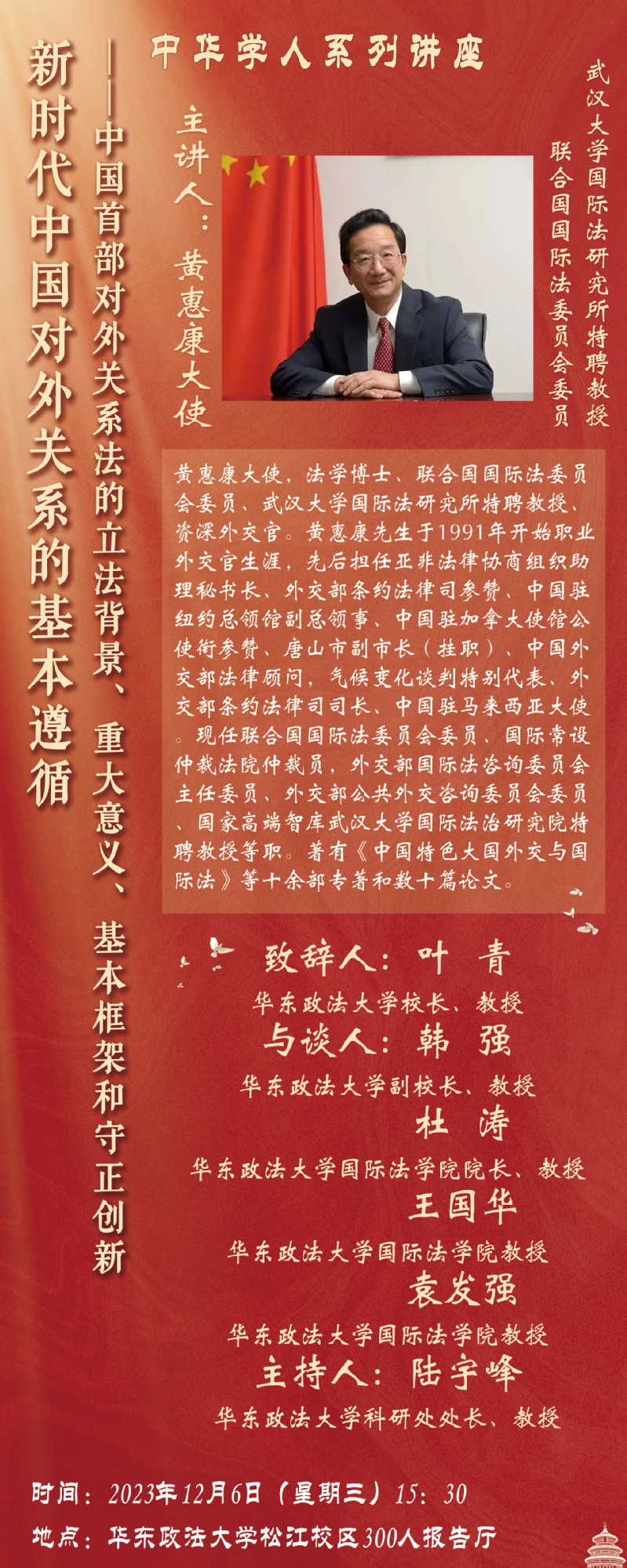 講座主題:新時代中國對外關(guān)系的基本遵循―中國首部對外關(guān)系法的立法背景、 重大意義、基本框架和守正創(chuàng)新