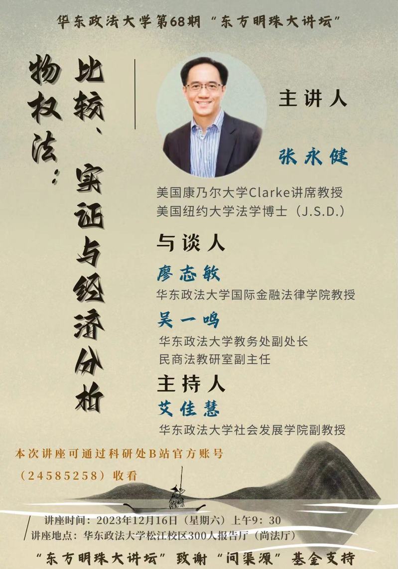 有鑒于此,華東政法大學第68期“東方明珠大講壇”有幸邀請到美國康乃爾大學Clarke講席教授張永健主講“物權法:比較法、實證研究、經濟分析”。