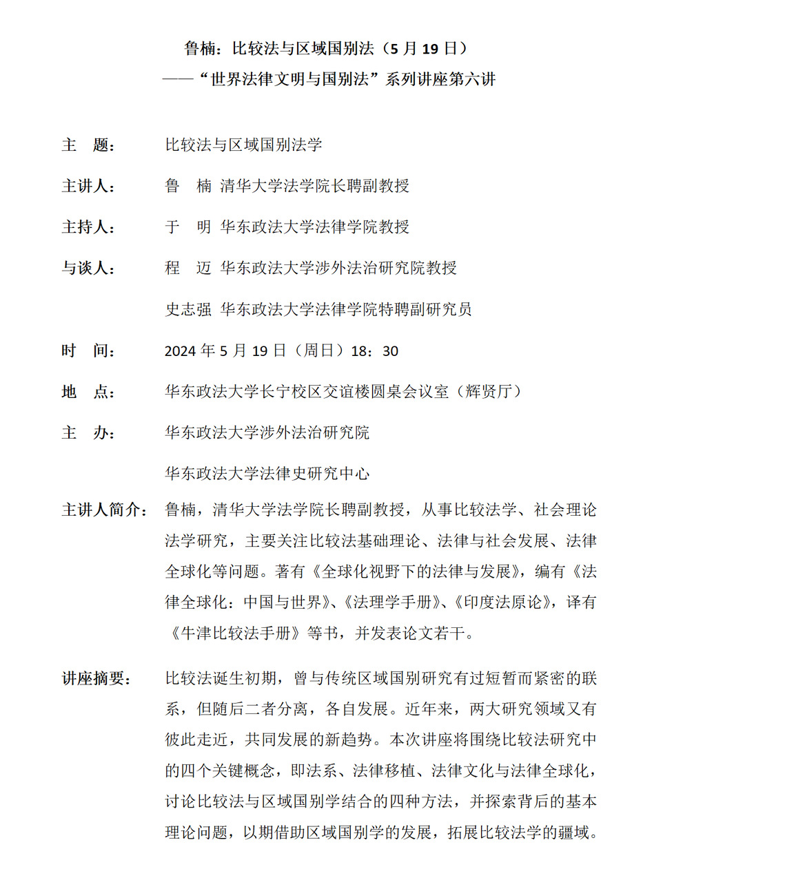 魯楠:比較法與區域國別法(5月19日) ——“世界法律文明與國別法”系列講座第六講