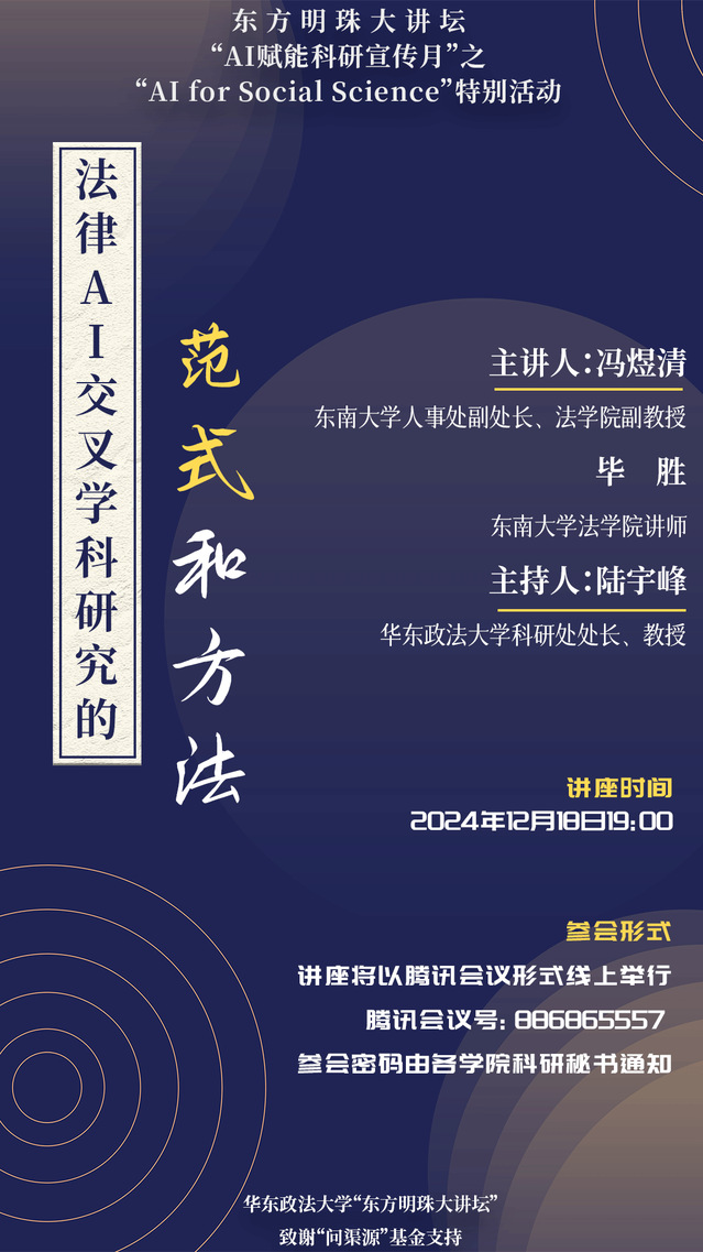 本期“東方明珠大講壇”有幸邀請到東南大學人事處副處長馮煜清副教授和法學院畢勝博士主講“法律AI交叉學科研究的范式和方法”。活動由我校科研處處長陸宇峰教授主持。